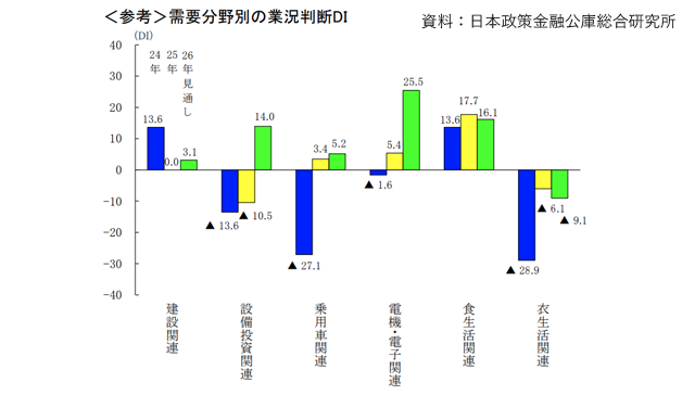日本政策金融公庫総合研究所が12月11日に公表した「中小企業景況調査」の付帯調査結果(PDF)によると、2026年の建設関連の業況判断DI(※)は3.1となり、24年の13.6には及ばないものの25年実績の0.0から若干持ち直す見通し。主要分野全体では25年の0.5から8.1ポイント上昇し、8.7となる見込みだ。