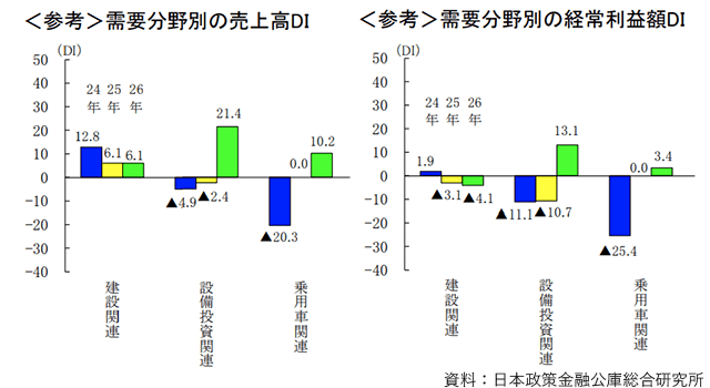 26年の建設関連の「売上高DI」は前年比横ばいの6.1、「経常利益額DI」は1.0ポイント減の▲4.1、「販売価格DI」は0.1ポイント増の32.0、「仕入価格DI」は0.4ポイント増の36.0となった。需要が底堅く推移し、価格転嫁も一定程度進んだが、高止まりする資材価格や人件費の上昇などにより厳しい局面が続くと見込んだ。