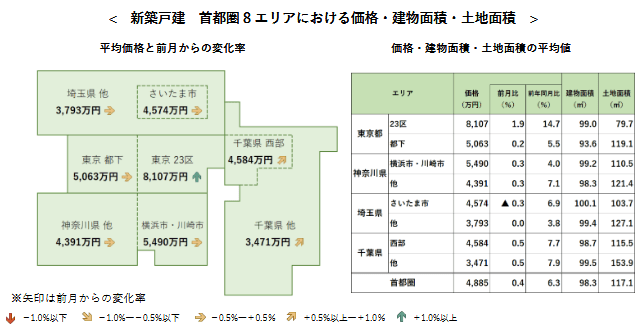 首都圏全体の平均価格は前月比0.4%増の4885万円と4カ月連続で上昇した。埼玉県を除く6エリアで上昇し、東京都(23区/都下)、神奈川県(横浜市・川崎市/他)、千葉県(西部/他)で2017年1月以降最高額を更新した。前年同月比は6.3%増と15カ月連続で上昇し、全8エリアで8カ月連続前年同月を上回った。首都圏全体で上昇基調が続いている。