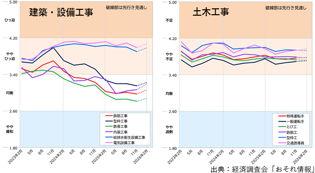 土木工事では、「特殊運転手」(3.77)、「一般運転手」(3.69)、「交通誘導員」(3.94)の3職種で不足感が上昇。資材の運搬や現場の安全管理を担う人材の不足が目立っている。「型枠工」も3.94とひっ迫した状況が続く。今後、6職種のすべてで「やや不足」の状況が継続。運転手・誘導員など3職種では不足感がさらに上昇する見通しだ。