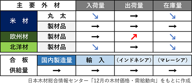 日本木材総合情報センター(JAWIC)が12月19日に公表した「12月の木材価格・需給動向」によると、米国材は丸太の入荷量・在庫量が減少する見通し。欧州材は出荷量の増加により在庫が減少。北洋材では入荷量は横ばいながらも出荷量が増え、在庫が減少すると予測した。合板は国内製造量・輸入量ともに横ばいで推移する見込みだ。