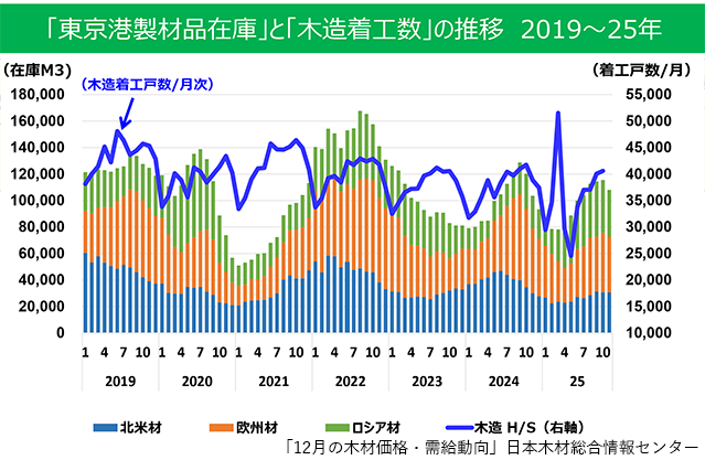 米材は、カナダで関税問題などの影響を受け、製材工場での減産や操業停止が相次いでいる。米国では船積み必要量は順調に伐採されているが、11月初めと比べて15種平均が6%下落した。東京木材埠頭の入荷量は前月比で25.7%の減少。確認審査の遅れが解消されたこともあり、製材品需要は今夏に比べて回復している。