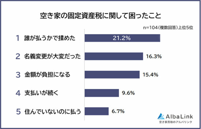 空き家の固定資産税に関する困りごとでは「誰が払うかで揉めた」(21.2%)や「名義変更が大変」(16.3%)が上位を占める。「金額が負担になる」(15.4%)も一定割合を占めたものの、た。金銭的負担以上に相続時の手続きや家族間の調整によるストレスが大きいと見られる。