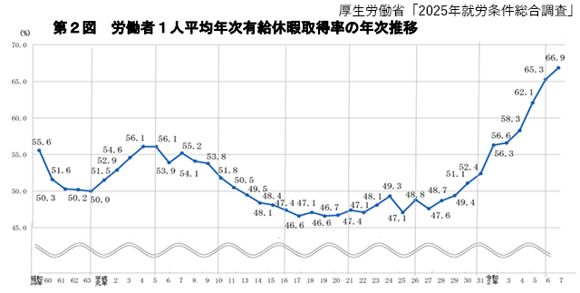 厚生労働省が12月19日に公表した2025年の「就労条件総合調査」結果(PDF)によると、2024年の1年間に企業が付与した年次有給休暇日数の平均は労働者1人当たり18.1日で、このうち労働者が取得した日数は12.1日となり、1984年以降で最多を更新した。取得率は66.9%に達し、こちらも同年以降最も高い水準となった。