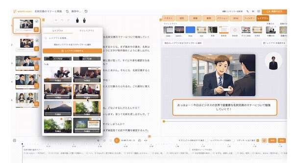 文章を入力または資料(PowerPoint/Word/PDF)をアップロードすると、読み上げ音声付きの説明動画を作成するクラウドサービス。