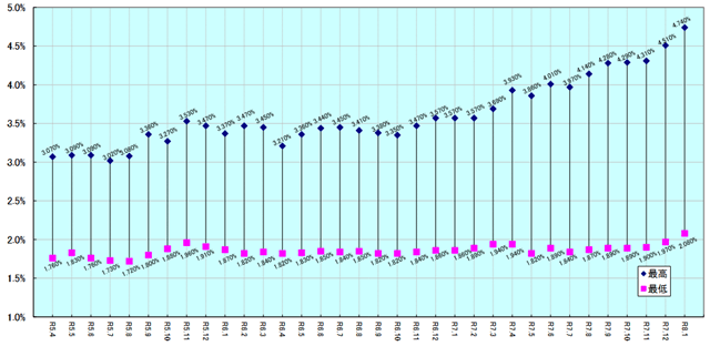 返済期間21年以上35年以下の最低金利は、融資率9割以下が2.08%、9割超が2.19%と、いずれも前月から0.11ポイント上がり、3カ月連続上昇した。最高金利は、9割以下が4.74%、9割超が4.85%で、前月から0.23ポイント上昇した。