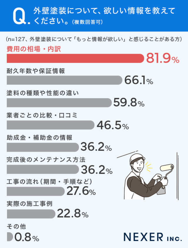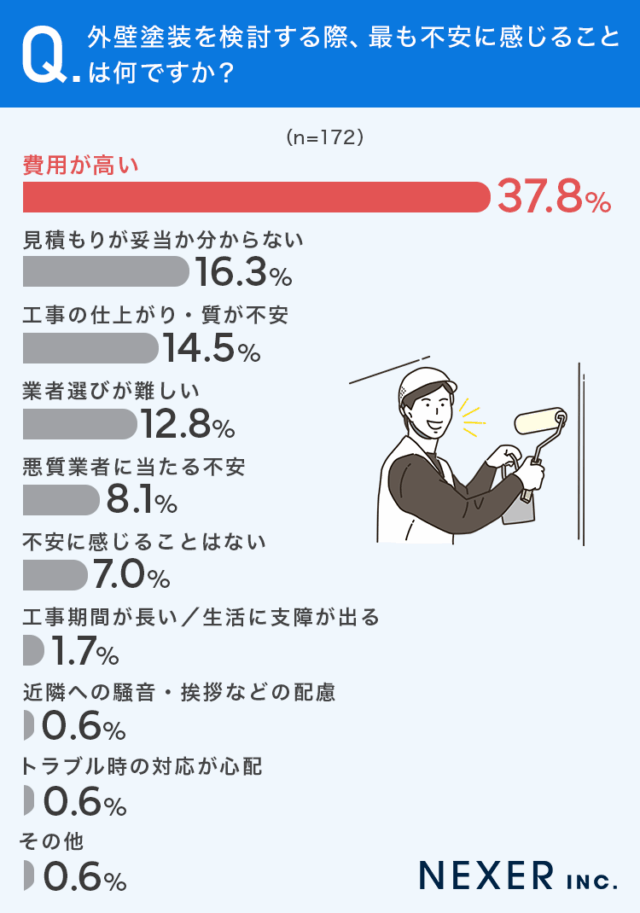 デジタルマーケテイングのNEXER(東京都豊島区)は、外装リフォームの塗り替えショップ(愛知県名古屋市)と共同で、持ち家の外壁塗装に関する調査を実施した。検討時は費用や見積もりに対する不安を抱きやすく、費用の相場や内訳に関する情報を求める層が突出して多いという結果になった。