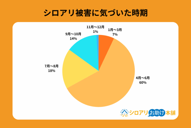 蟻害に気づく時期では4~6月が最多。「羽アリを見た」ことで被害に気付いたとの答えが71%を占める(下グラフ)。シロアリの被害が表面化するまでには、シロアリの活動開始から数カ月を要する。同社では「布基礎・ベタ基礎を問わず、定期点検と予防が欠かせない」としている。