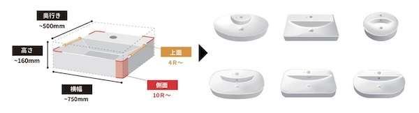 まずヒアリングを行い、図面・モックアップ製作、型製作・修正ののち、品質を検証して生産する。サイズは対応範囲内であれば自由に指定することができ、色は基本色ホワイトに加え、10種類の受注色、特注色も可能とする。