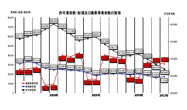 国土交通省が5月28日発表した、2013年3月末現在の建設業許可業者数は46万9900業者で、前年同月比1万3739業者の減少(2.8%減)だった。建設業許可業者数が最も多かった2000年3月末時点(1999年度)と比較すると、21.8%減。