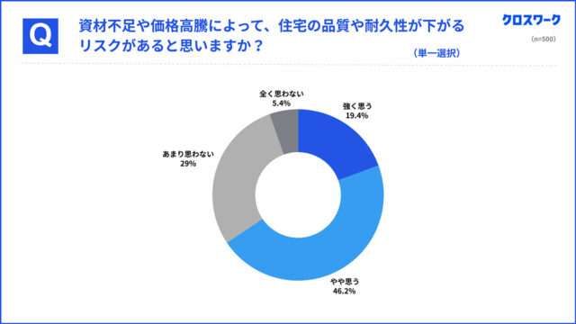 資材価格の高騰は89.6%が実感している。さらに、資材の不足や価格高騰により「将来的に住宅品質が下がる可能性」があるとの回答が65%を占めた。同社では、資材高騰や人手不足、技術継承の停滞が長期化した場合「品質維持のためのコストがかさみ、消費者負担(住宅価格)に跳ね返る懸念も否定できない」と指摘している。