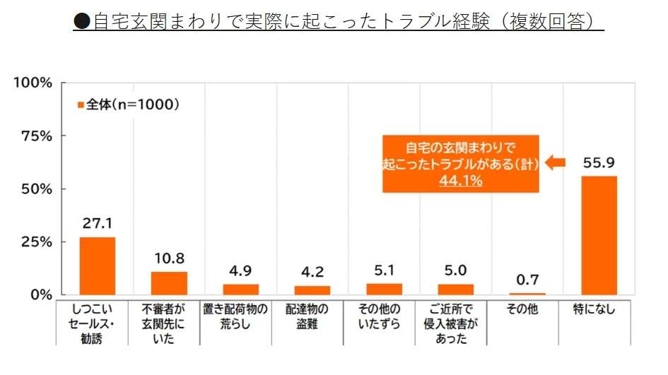 玄関まわりで何らかのトラブルを経験した人は44.1%を占める。具体的なトラブルの内容では「しつこいセールス・勧誘」(27.1%)や「不審者の来訪」(10.8%)、「置き配荷物荒らし」(4.9%)、「配達物の盗難」(4.2%)などが挙がった。