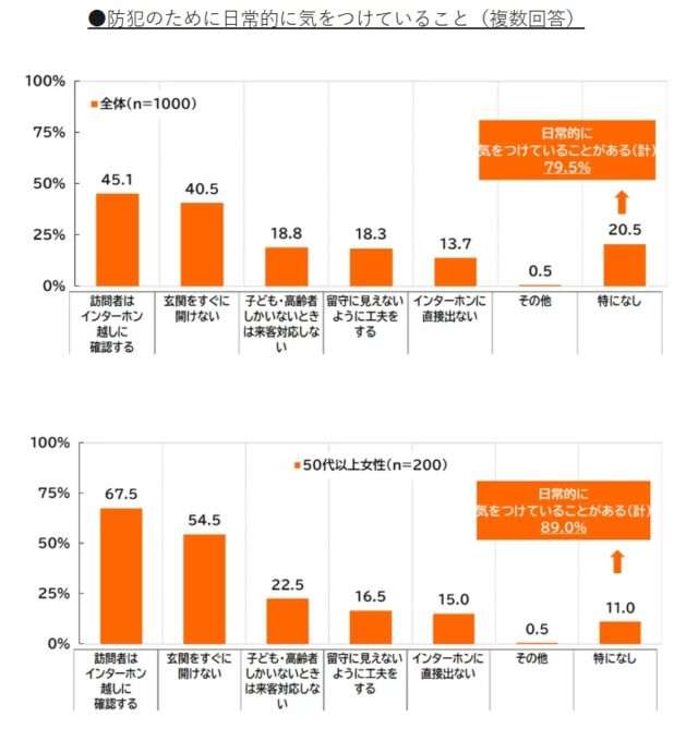 また、全体の79.5%は防犯を日常的に意識していると回答しており、50代以上の女性(89%)は特に割合が高い。