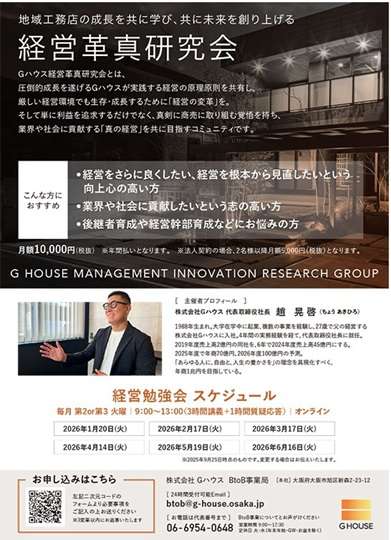 Gハウス(大阪市)が主宰する地域工務店の経営力向上を目的とした「Gハウス経営革真研究会」が始動した。同研究会は、“共に学び、共に創る”を理念に掲げ、地域工務店や住宅会社の経営者が集い、最新の住宅トレンドや経営ノウハウを共有する場として設立。