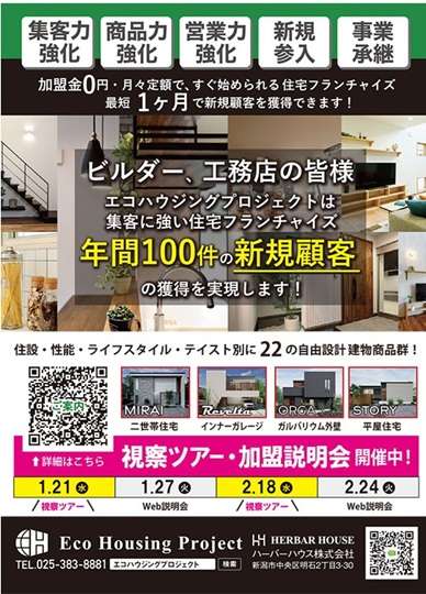 ハーバーハウス(新潟市)が運営する住宅フランチャイズ「エコハウジングプロジェクト」は、年間100件の新規顧客の獲得を実現できる「集客に強い」フランチャイズとして、現在、全国の工務店・ビルダーの加盟店を募集している。