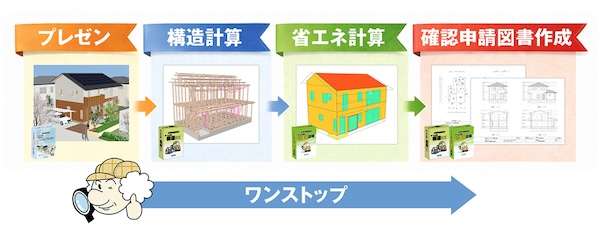 「ホームズ君シリーズ」は、住宅の初期プレゼン→構造計算→省エネ計算→確認申請までを一貫して行える設計業務支援ソフト。