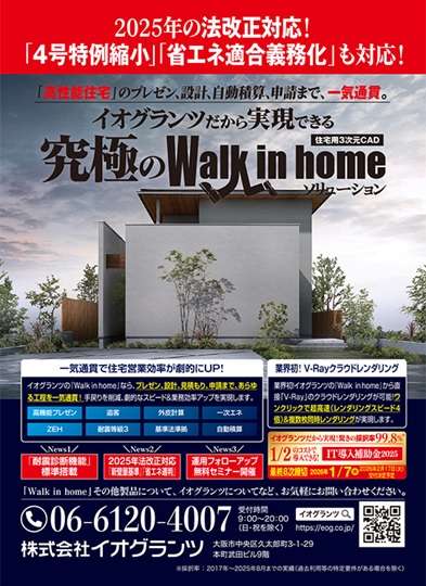 イオグランツ(大阪市)は、高性能住宅のプレゼン・積算・設計・申請の全工程で大活躍する住宅用3次元CAD「Walk in home」の最新版をリリースした。4号特例縮小・省エネ適合義務など2025年法改正に対応し、リフォーム耐震診断機能を標準搭載する。構造計算オプションで、許容応力度計算もデータ連携で業務を効率化し、生産性向上を実現する。
