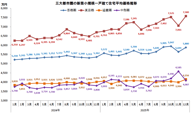 東京カンテイ(東京都品川区)が1月8日に発表した12月の首都圏における新築小規模一戸建て(土地面積50㎡以上100㎡未満)の平均価格は、前月比4.2%増の5880万円と上昇に転じた。前年同月比も9.7%増と再び10%前後の水準となった。