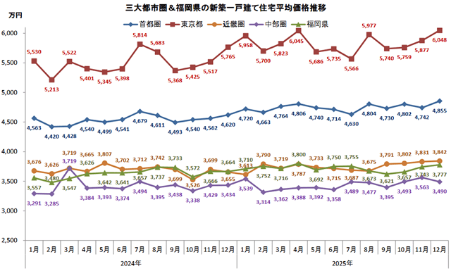 東京都は2.9%増の6048万円と3カ月連続上昇。神奈川県は4.7%増の5222万円と反転上昇し、再び5000万円台に。千葉県は0.2%増の4100万円と3カ月連続上昇となったが、2025年夏頃の水準には届いていない。埼玉県は3941万円でほぼ横ばいとなった。