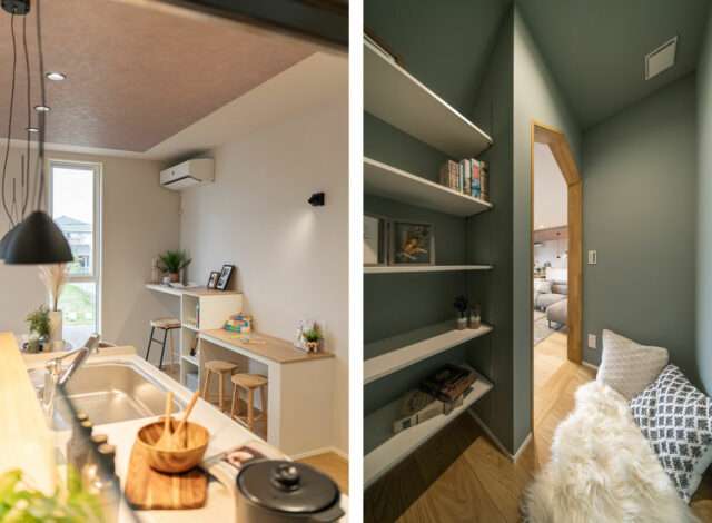 左:1階LDKのワークスペース。カウンターは段違いになっており、親子並んでの利用が可能