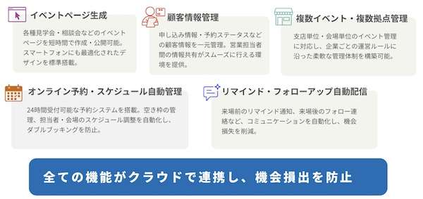 各種見学会・相談会のイベントページを短時間で作成・公開し、申し込み情報や予約ステータスなどの顧客情報を一元管理することができる。24時間受付可能なオンライン予約システムを搭載。支店・会場単位でのイベント管理に対応し、来場前のリマインド通知や来場後のフォロー通知も自動化できる。