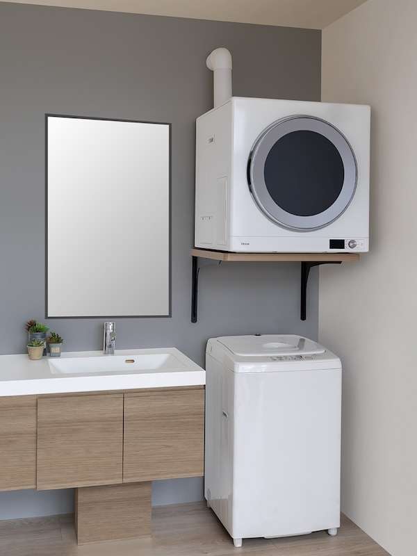 厚み32×奥行600×幅650mmとコンパクトで、スペースに余裕のない脱衣室やランドリールームでも洗濯機の上にガス衣類乾燥機を取り付けることができる。