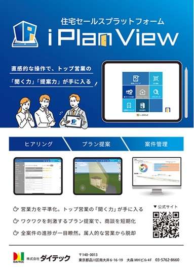 ダイテック(東京都品川区)が提供する住宅セールスプラットフォーム「iPlan View」は、iPadの直感的な操作性を生かし、属人化しがちな住宅営業のノウハウを“誰でも再現できる仕組み”へと変える営業支援ツール。ヒアリングからプラン提案、3D・ARによる可視化、概算見積までをワンストップで対応し、商談データはクラウドで即共有。設計・見積担当者との連携がスムーズになり、営業品質の平準化と成約率向上に寄与する。