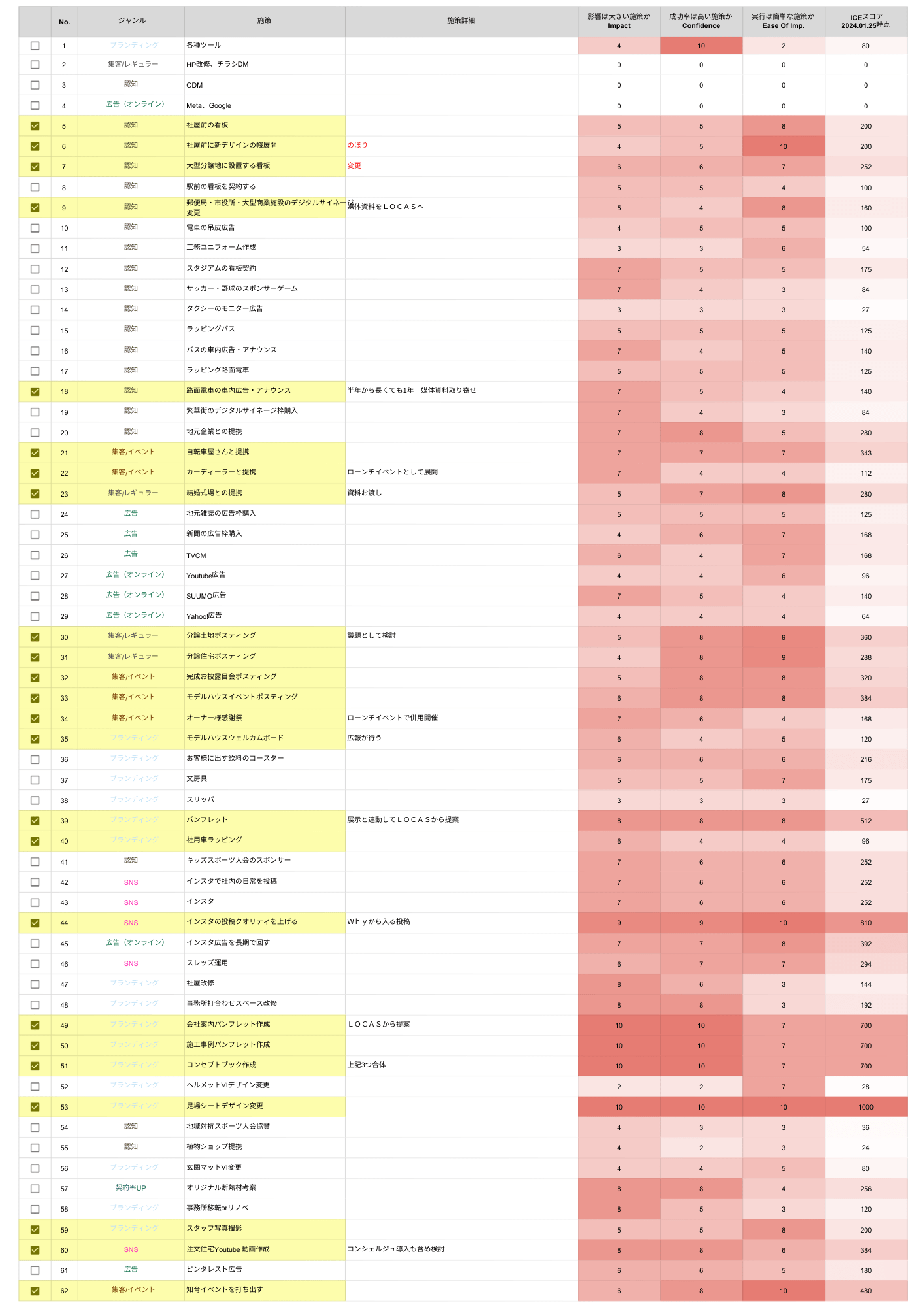 (例)従来はチラシやSNSが中心だった工務店が、ICEスコアの活用により施策を約100件抽出。限られた時間と人員で取り組むべき施策の優先事項を特定できました。