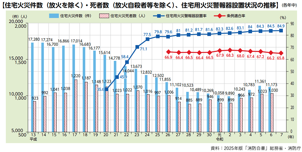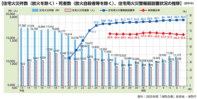 住宅用火災警報器の設置率は年々上昇。25年6月1日時点での設置率は全国で84.9%となった。その一方で、条例で設置が義務付けられている箇所のすべてに火災警報器を設置している世帯は、65.8%にとどまっている。さらに設置義務化から10年以上経過し、機器の寿命や電池切れが課題となっている。