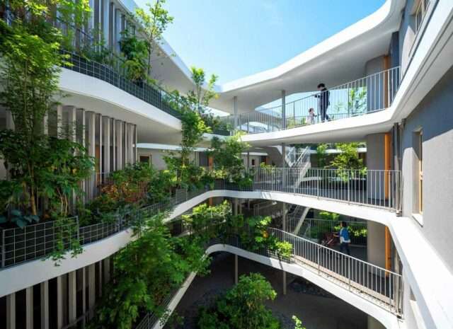 国土交通大臣賞に輝いたのは、竹中工務店が手がけた「代々木参宮橋テラス」。東京都渋谷区に建つ鉄筋コンクリート造4階建ての集合住宅だ。延床面積は6913.49㎡で、建築主、設計、施工まですべて同社で担った。
