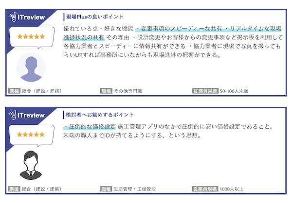 「ITreview」に寄せられた「現場Plus」のレビュー