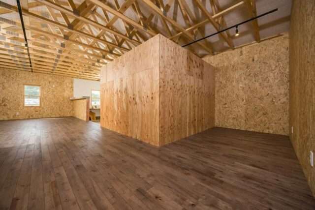 展示場内観。無垢フローリング、針葉樹合板やOSB など素材感を強めた