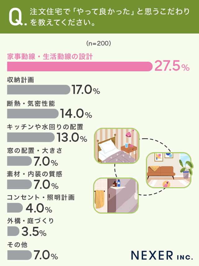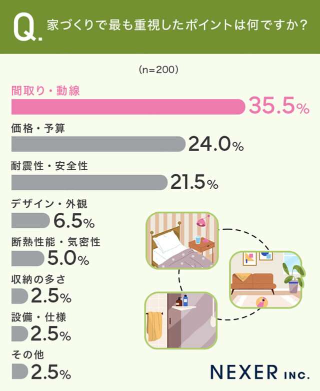 家づくりで最も重視した点としては「間取り・動線」(35.5%)がトップ。その他には予算など現実的な理由から「価格・予算」(24.0%)や、安全性を重視して「耐震性・安全性」(21.5%)を挙げる回答者も多かった。