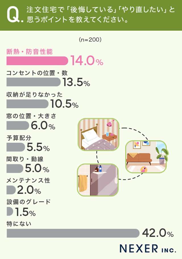 建築後、後悔している点が「特にない」回答者は42.0%。満足度は高い傾向にあるものの「断熱・防音性能」(14.0%)や「コンセントの位置・数」(13.5%)、「収納不足」(10.5%)に後悔しているとの声も一定割合を占める。寒さや暑さ、暖房効率の悪さ、使い勝手など、入居後でなければわかりにくい要素に後悔を感じている層が存在することがうかがえる。