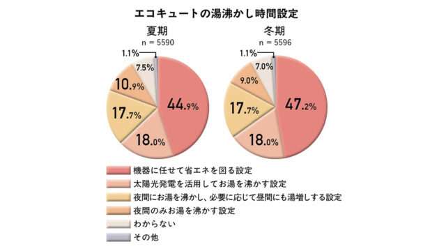 自家消費に大きく関わる沸き上げ時間の設定をみると、最も多いのは「機器に任せて省エネを図る設定」。夏・冬のいずれも4割を超えている。太陽光発電の自家消費を意識した設定は17.7%で、運転方法が自家消費に最適化されていないケースも一定数ある可能性が考えられる。