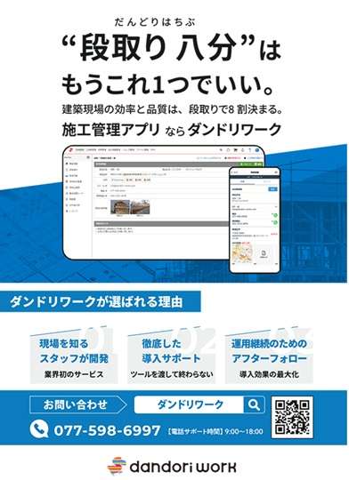 建築現場の効率と品質は段取りで決まると言われる中、ダンドリワーク(滋賀県草津市)は、その考え方を実践レベルに落とし込んだ施工管理アプリ「ダンドリワーク」を提供している。図面・写真・資料など現場に必要な情報をクラウド上で一元管理し、電話やFAX中心の旧来型の連絡手段が生む手間とミスを解消する。