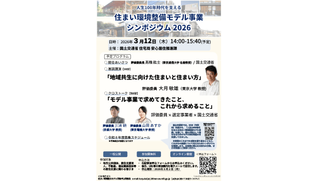 国土交通省は3月12日、「住まい環境整備モデル事業シンポジウム2026」(PDF)をオンラインで開催する。