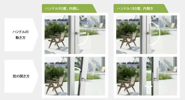 1つのハンドル操作で内開き(ドレー)と内倒し(キップ)の2通りの開放形式が選べ、内開きではフルオープンにして室内側から外のガラス清掃が行える。