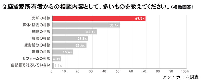 不動産情報サービスのアットホームが公表した「空き家取引に関する実態・意識調査結果」によると、空き家対策に取り組む自治体の47.8%が空き家に関する相談件数が「増加した」と回答している。受けた相談の69.5%が「売却の相談」で、他に「解体・除去の相談」(50.4%)、「管理の相談」(33.1%)などが上位を占めた。