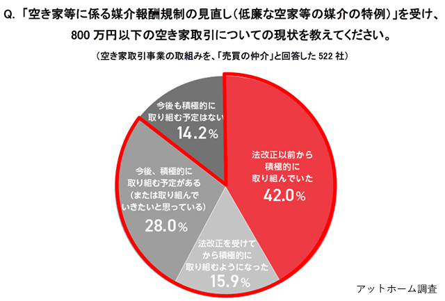 その一方で、「物件の状態が悪い」などにより、物件価格が800万円以下となっている低廉な空き家の取引に、8割以上の不動産会社が関心を示していることも分かった。このうち仲介報酬に関する法改正をきっかけに積極的に取り組みを進めている事業者は約半数となっている。