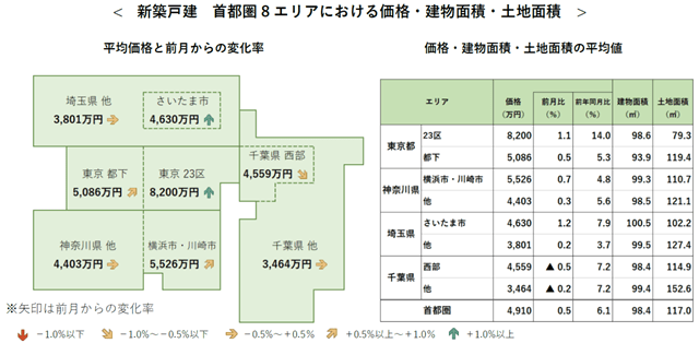 首都圏全体の平均価格は前月比0.5%増の4910万円と5カ月連続で上昇した。千葉県を除く6エリアで上昇し、東京都(23区/都下)、神奈川県(横浜市・川崎市/他)、埼玉県(さいたま市/他)で2017年1月以降最高額を更新した。前年同月比は6.1%増と16カ月連続で上昇し、全8エリアで9カ月連続前年同月を上回った。首都圏全体で上昇基調が続いている。