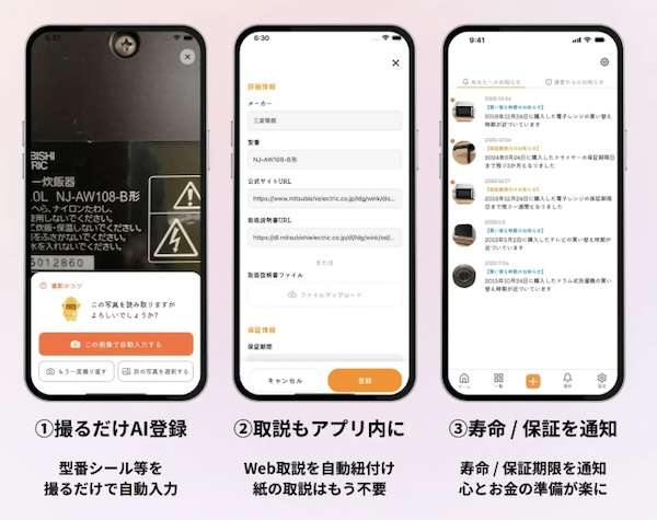 入力作業はAIが代行するため、型番シールや取扱説明書の表紙をアプリのカメラで撮影するだけでAIが画像を認識して商品名・メーカー名・型番などの情報を自動で記録。型番情報に基づいてWeb上の取扱説明書やメーカー公式サイトへと自動で紐付ける。