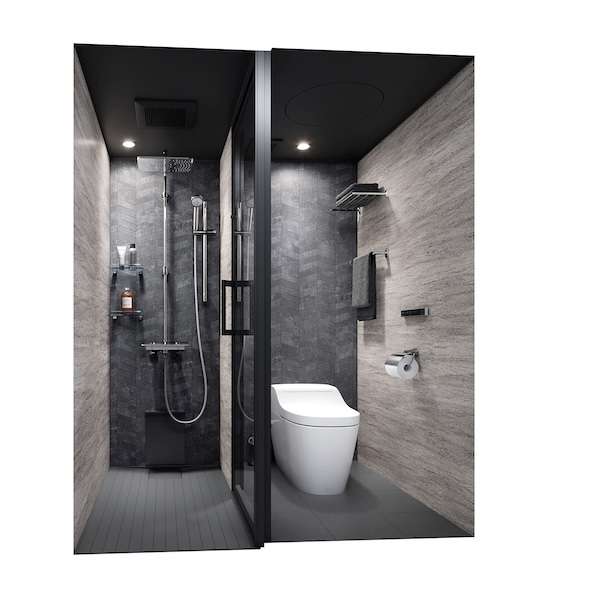 天井・間仕切りドア・床はブラック系とホワイト系の色を用意してモノトーンでコーディネートできるようにし、間仕切りドアには強化ガラスのスイングドアを、洗面ボウルにはスクエア形状の陶器製ボウルを設定してホテルライクな雰囲気を強化。さらに、天井高が高い物件に対応するH100・200mmアップを可能にした。
