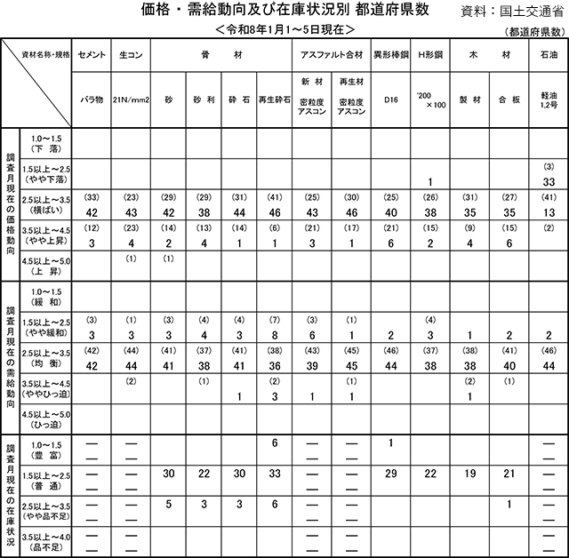 国土交通省が1月26日に発表した「主要建設資材需給・価格動向調査結果」(2026年1月1~5日調査実施)によると、価格動向は石油が「やや下落」となり、その他の資材は「横ばい」で推移した。需給動向はすべての資材で「均衡」、在庫状況はすべての資材で「普通」となった。