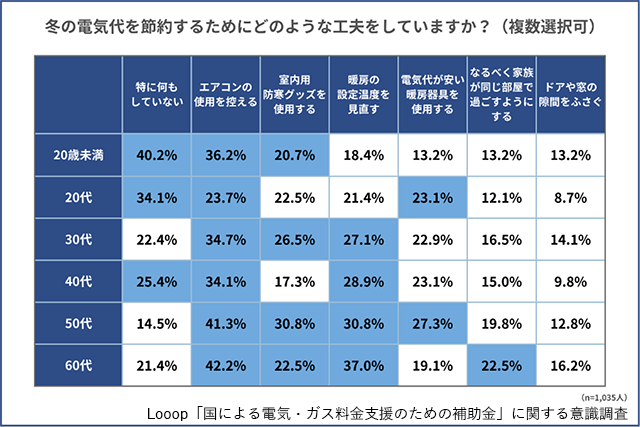 また、「冬の電気代を節約するためにどのような工夫をしているか」については、「エアコンの使用を控える」「暖房の設定温度を見直す」と答えた人が多数に。中でも「エアコンの使用を控える」は、50代(41.3%)、60代(42.2%)で高い傾向にあり、高齢層の人ほど寒さを我慢して節電に努めている実態が浮き彫りとなった。