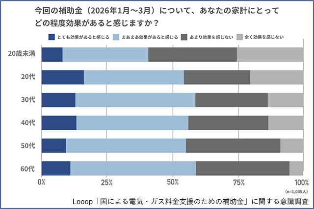 物価高対策として国が1月から実施している「電気・ガス料金支援」の認知度については、全体の65%が「知らない」と回答。「知っている」と答えた人は若年層ほど少数にとどまった。その一方で、「支援策の効果を感じている」と答えた人は全体の半数を超えている。
