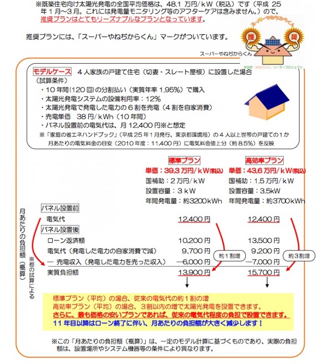 都の試算によれば、都内4人家族の戸建て住宅に3kWの太陽光発電を設置し、10年間の専用ローンを使って導入した場合、10年間は実質負担が1万3900円と設置前より1割増えるものの、11年目以降は自家消費と売電収入で従来の電気代を大きく削減できる。