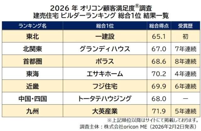 オリコン(東京都港区)は2月2日、全国7地域を対象にした「2026年オリコン顧客満足度調査 建売住宅ビルダー」の結果を公表した。各エリアで地場ビルダーの強さが際立つ結果となり、首都圏ではポラスが8年連続、中部ではエサキホームが4年連続、近畿ではフジ住宅が6年連続で総合1位を獲得した。中国・四国エリアは今年が初公表で、トータテハウジングが総合1位となった。