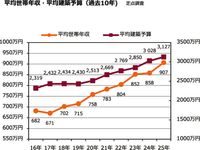 また、世帯年収の平均は907万円で初めて900万円を突破し、予算も前年から約100万円増の平均3127万円となった[グラフ2]。