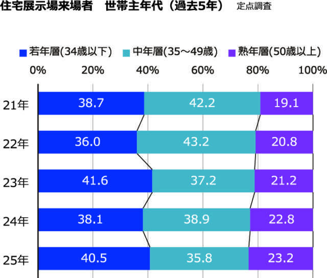 来場者に占める若年層(34歳以下)の割合は全体の40.5%。前年比では2.4ポイント増で、若年者の持ち家志向の高まりも見え隠れする。50歳以上の熟年層は23.2%で、前年比では0.4ポイント増と微増ながら、21年以降増加が続く。